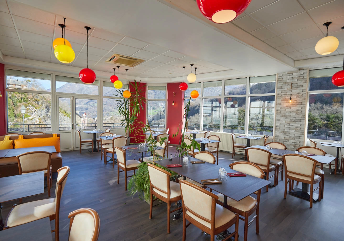 En traversant la rue pour vous restaurer, découvrez une salle de restaurant avec vue panoramique 40 couverts, spacieuse, lumineuse et climatisée, 20 couverts en terrasse, en surplomb du gave de Pau.
